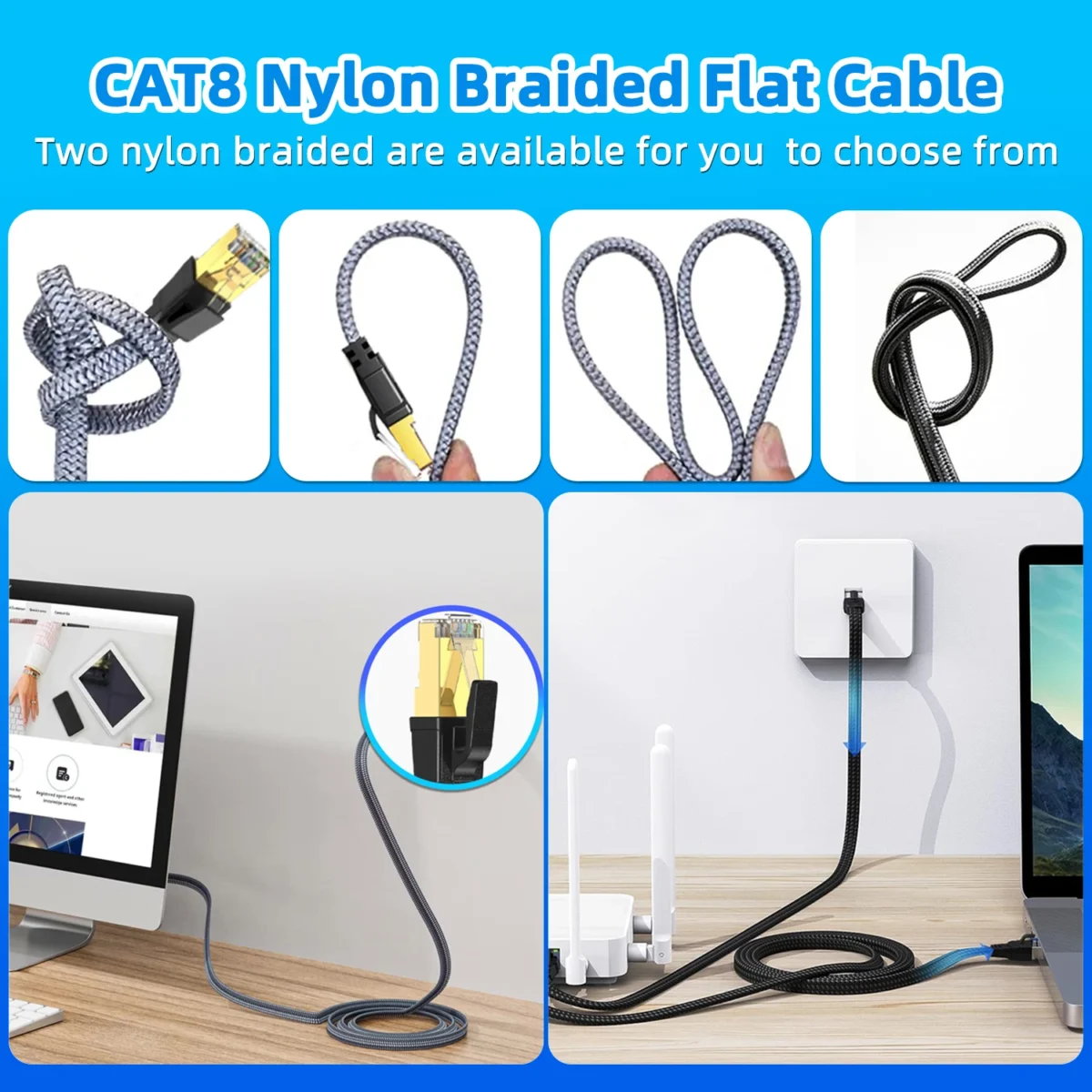 CAT 8 cable compatible with CAT7, CAT6, CAT5 cable standards. ?Flat cat8 Eethernet cable constructed with the rj45 connector makes it perfects for servers, TV, TV Box, laptop, PC, printer, networking switch, routers, ADSL, adapters, hubs, modems, PS3, PS4, x-box, Patch panels and other device with RJ45 connectors.
